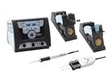 | ✚✚✚ Weller Soldering Station, Dual Channel, WX2021, 120V Built from our customer's best ideas! A powerful new easy-to-use 2-channel soldering station with intelligent soldering tools and a number of innovations. Features: Quick heating time; Uses 200W tools or simultaneous use of two 120W tools; Anti-static glass touch screen; Intuitive user interface including turn-and-click wheel with entry key, finger guide and six touch keys; Multiple language menu navigation; Graphic LC display with easy-to-read blue LED back lighting; Display can be read all angles; Standard digital and decoupled robot connection; Two connections manage fume extraction units, heating plates and programmable logic controls; WX tool connection with tool recognition and digital data transfer; Separate pins for 12V and 24V; Multi-purpose USB port; Analog-to-digital converter and data memory; Calibration not required due to bit in soldering iron handle; Spring-loaded tip barrel with WXT 120 has anti-static soft grip and allows tips to be changed without tools; Energy-saving sleep mode on iron and all accessories with no special stop-and-go rest required. WX2021 Dual Soldering Station, WXMP Micro Soldering Iron, WXMP Micro Desoldering Tweezer, WDH50 Holder w/WDC2 dry cleaner for WMRP WDH60 Desoldering Tweezers and Stand, 120V ESD Safe