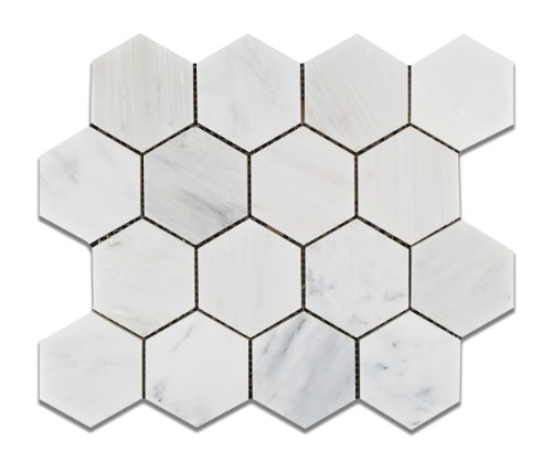 FeaturesItem offered: 50 sheet Lot of Premium Oriental White - Eastern White Marble 3" Hexagon HONED Mosaic Tile on Mesh / Sold by: Lot (50 sheets)Finish: Honed (Flawless, smooth / matte)Sheet Size: 10 1/2" X12 1/8" / Chip Size: 2 15/16" (Side-to-side) X 3 3/8" (Diag.) / Thickness: 3/8"FREE UPS GROUND INSURED SHIPPING applies to all orders on this itemPlease see our specific policy pages under the "detailed seller information" section to get more details on returns, exchanges, damages and refunds Oriental White - Eastern White Marble 3" Hexagon HONED Mosaic Tile - Lot of 50 Sheets?