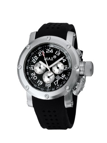 Phantom Sport Chronograph?A 24-hour wristwatch by MAX Watches - offering a quartz chronograph movement, top-grade stainless steel case, silver bezel and black silicon strap. Silver hands and numbers accent the sleek black face. The 3 chronograph dials and date window complete its simple, elegant design. This watch is water-resistant to 50 meters, has scratch-resistant mineral crystal and comes with a 2-year warranty - protecting against any manufacturing defects.